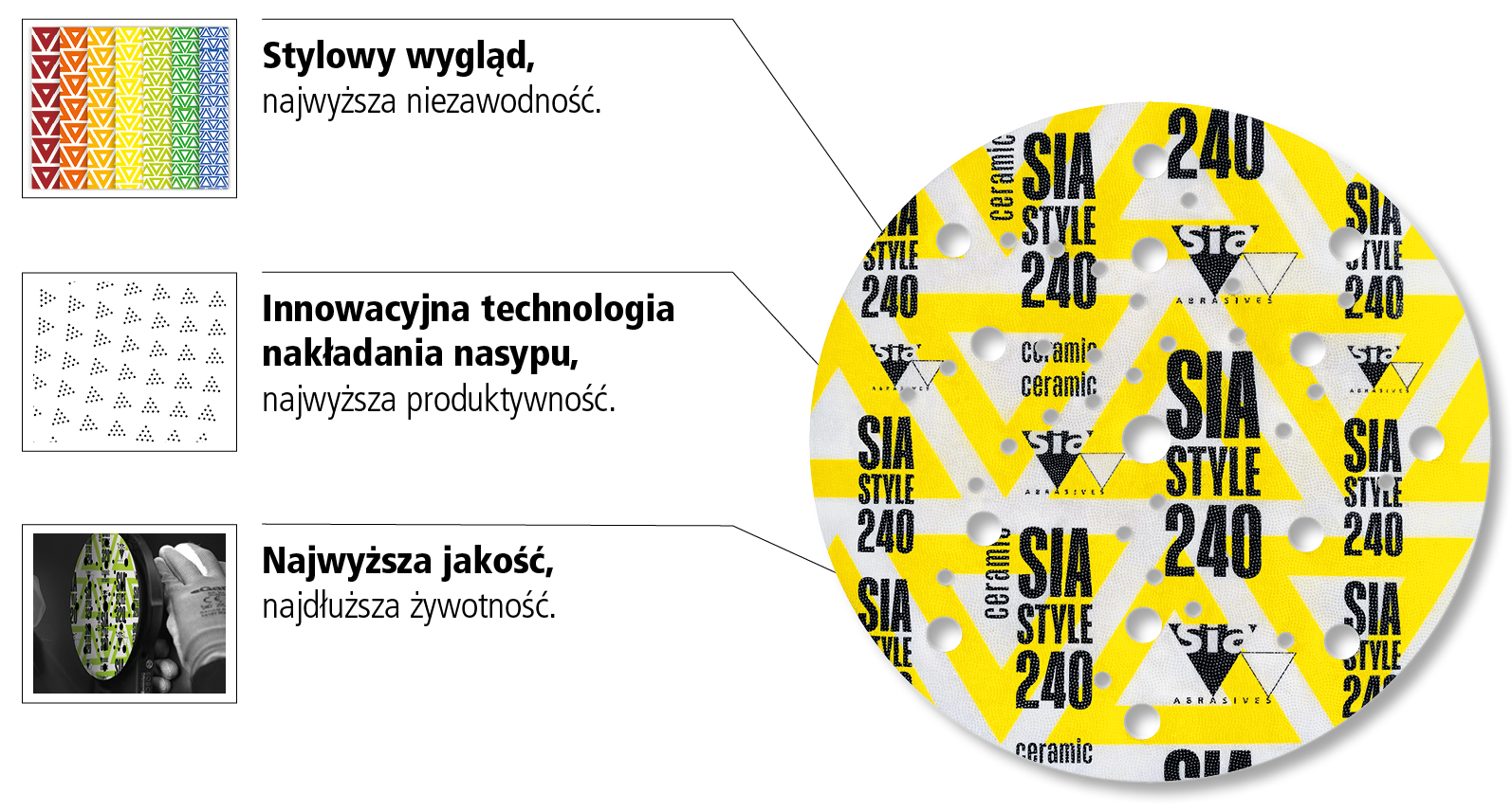 Nowy materiał ścierny 5500 siastyle z systemem znakowania kolorem przekonuje absolutnym bezpieczeństwem procesów oraz innowacyjnym wyglądem. Stabilnie rozmieszczone ziarno gwarantuje najwyższą produktywność i jednolity proces pracy. Wytrzymałe podłoże foliowe zapewnia wysoką odporność na rozerwanie i toleruje najwyższe obciążenia. Według nas to najbardziej stylowy materiał ścierny.